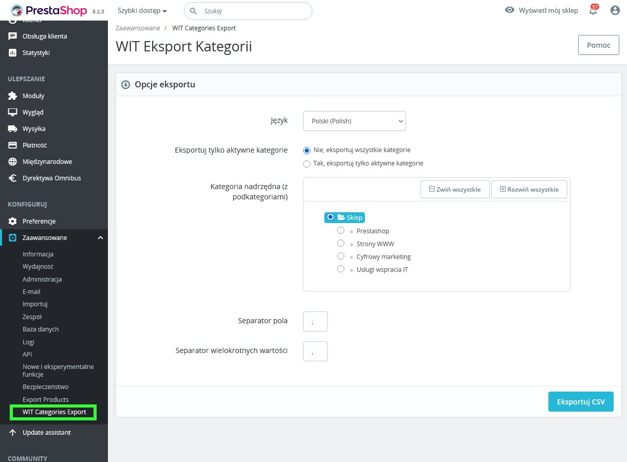 WIT Export Categories to profesjonalny moduł umożliwiający eksport kategorii PrestaShop do pliku CSV zgodnego z importerem systemu. Obsługuje wielojęzyczność, filtrowanie aktywnych kategorii oraz eksport całych poddrzew kategorii.