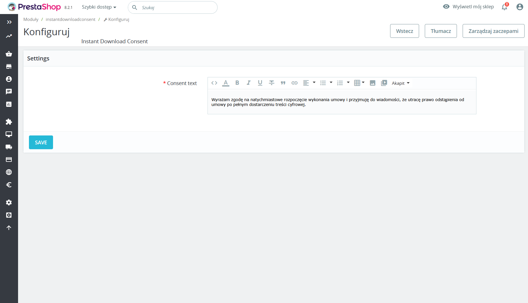 Moduł jest w pełni konfigurowalny z poziomu zaplecza: administrator może samodzielnie ustawić treść komunikatu w wielu językach oraz korzystać z wygodnego edytora wizualnego. Warunek zgody działa automatycznie — nie wymaga żadnych zmian w szablonie ani dodatkowej integracji. To proste i skuteczne rozwiązanie, które pomaga sprzedawcom usług i plików cyfrowych uniknąć sporów i zwrotów niezgodnych z prawem. Moduł Instant Download Consent jest zgodny z PrestaShop 1.7 i 8.x, łatwy w instalacji i gotowy do użycia od razu po włączeniu.
