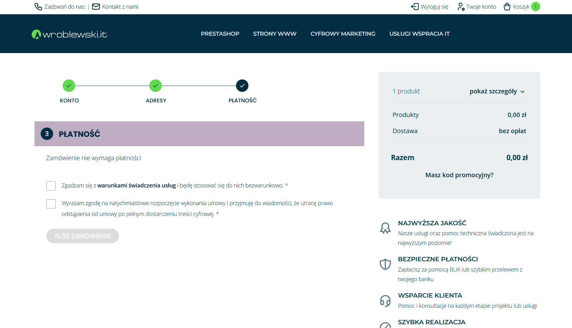 Instant Download Consent to dedykowany moduł dla PrestaShop, który zwiększa bezpieczeństwo prawne sprzedaży produktów cyfrowych i usług dostarczanych drogą elektroniczną. Automatycznie wykrywa, kiedy w koszyku klienta znajduje się przynajmniej jeden produkt wirtualny, i w takim przypadku wyświetla dodatkowy warunek do akceptacji podczas składania zamówienia. Dzięki temu klient wyraża zgodę na natychmiastowe rozpoczęcie realizacji umowy i jest informowany o utracie prawa odstąpienia od umowy po pełnym dostarczeniu treści cyfrowej — co spełnia wymogi art. 38 ustawy o prawach konsumenta.