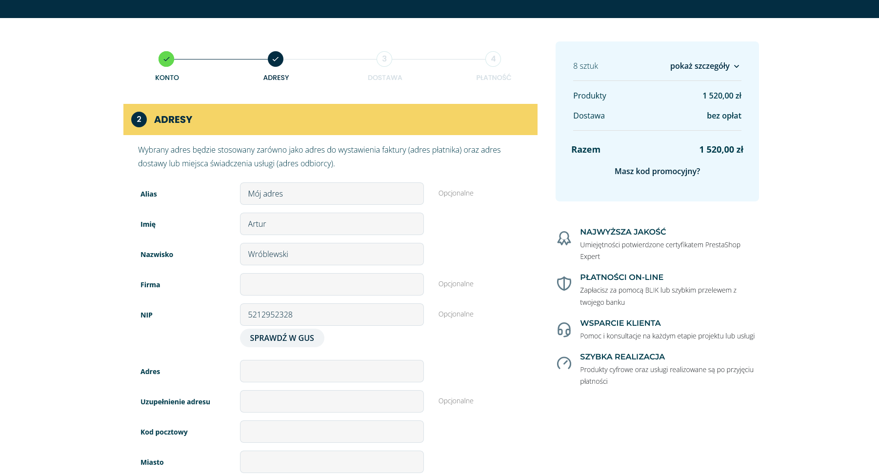 WIT NIP Validator + GUS to moduł dla PrestaShop, który automatycznie weryfikuje polski numer NIP oraz pobiera dane firmy bezpośrednio z bazy GUS (BIR1). Moduł sprawdza poprawność NIP już podczas jego wpisywania (cyfry + suma kontrolna), a następnie umożliwia jednym kliknięciem uzupełnienie nazwy firmy oraz danych adresowych w formularzu adresu i checkoutu. Rozwiązanie działa w pełni automatycznie, jest zgodne z PrestaShop 8 oraz 9 i odporne na dynamiczne odświeżanie formularzy. Idealne dla sklepów B2B oraz klientów firmowych w Polsce.