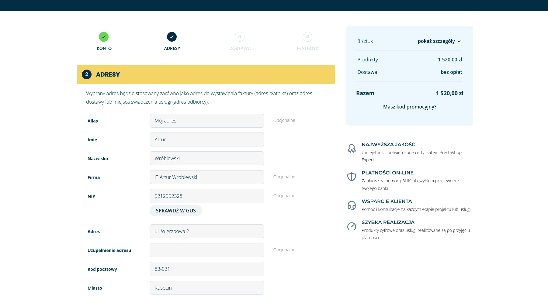 brak zapisu danych firmowych poza standardowym mechanizmem PrestaShop,