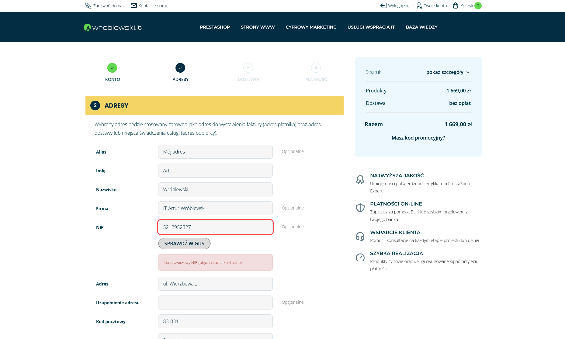 Błędny NIP jest natychmiast oznaczany zgodnie ze standardami PrestaShop (podświetlenie pola, komunikat błędu pod polem), bez potrzeby wysyłania formularza.